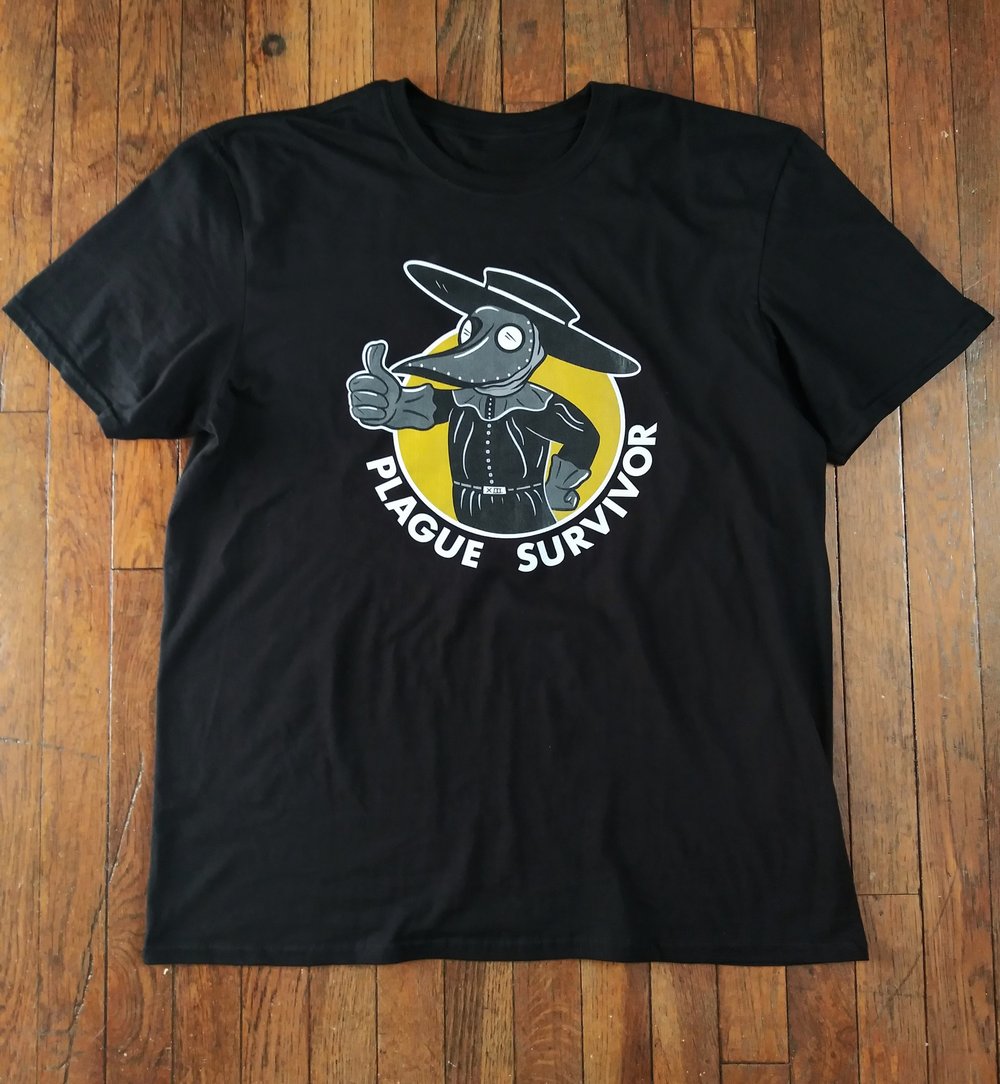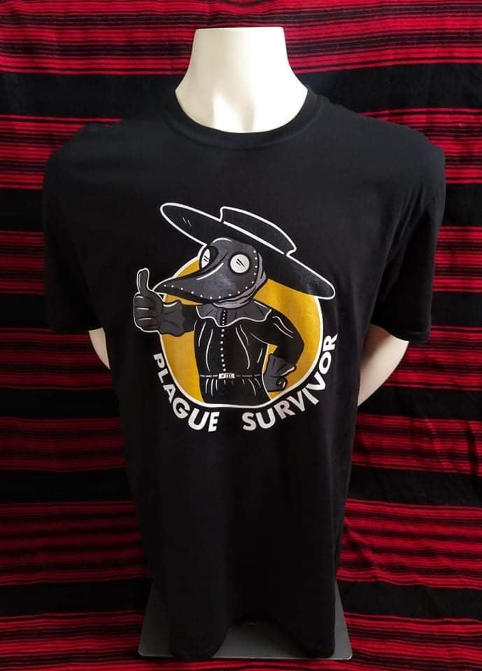 Inspiration taken from Bethesda's "Vault Boy", this is the Plague Survivor! Congratulations fellow human you survived the plague! Commemorate the achievement by wearing this shirt proudly for all to see.